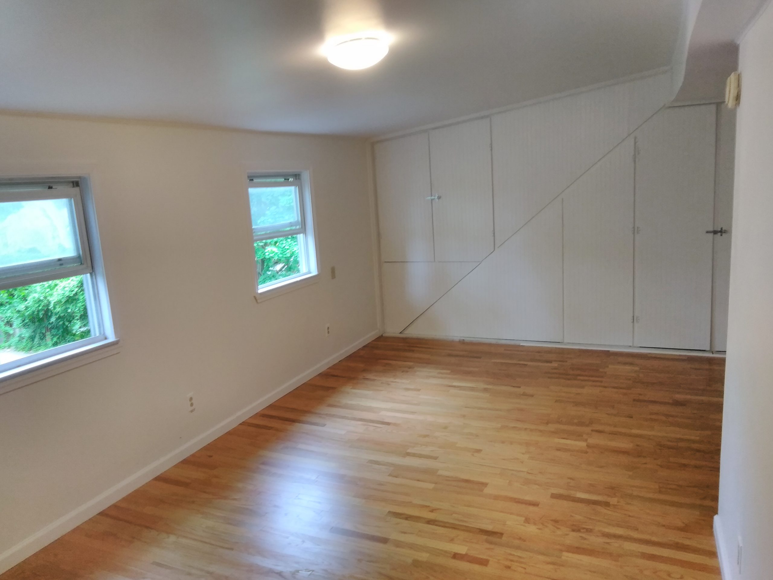A dated room was transformed with custom under-stair built-ins, structural refinishing, and restored hardwood floors.